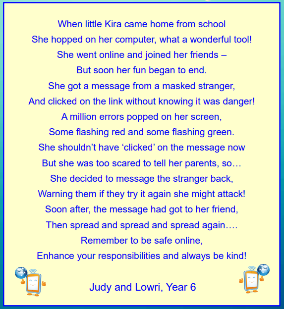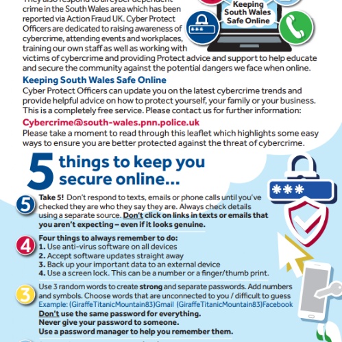 All pupils receive e-safety lessons as part of their curriculum. We have an annual visit from our School Liaison Officer from South Wales Police to talk about the issue of Cyber-bullying.