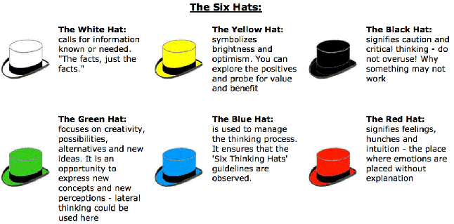 You can learn how to separate thinking into six clear functions and roles. Each thinking role is identified with a colored symbolic "thinking hat." By mentally wearing and switching "hats," you can easily focus or redirect thoughts, the conversation, or the meeting.